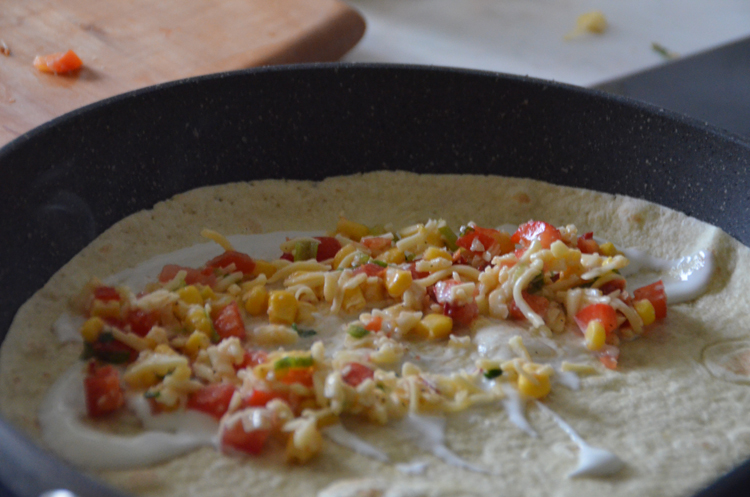 Lasst eine Pfanne heiß werden und legt jeweils einen Wrap-Fladen hinein. Dann kommt die Füllung und etwas von dem Sauerrahm drauf. Lasst das Ganze kurz warm werden, wenn der Fladen “elastisch” wird, könnt ihr ihn umklappen. Die Füllung verschmilzt dann so richtig mit dem Wrap.