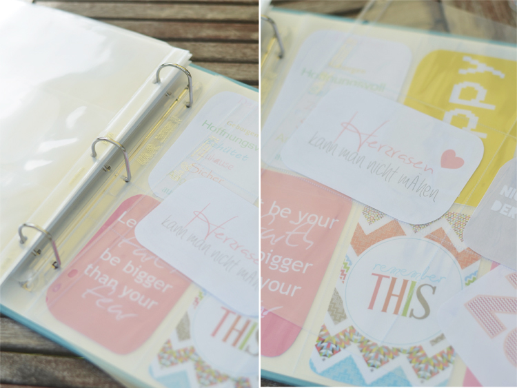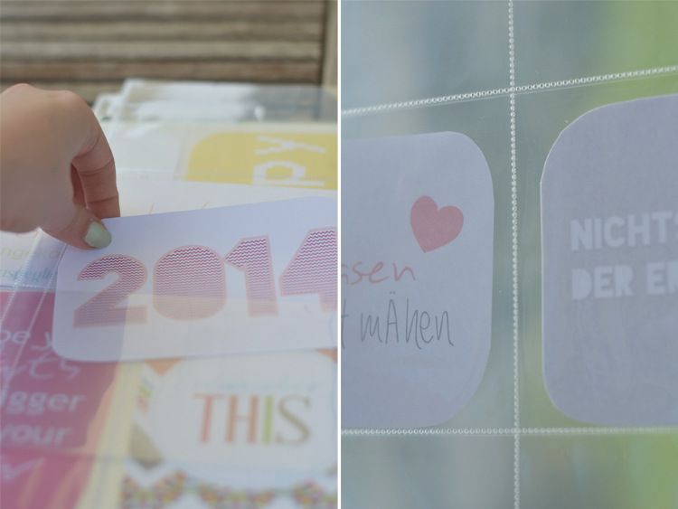 Ihr wisst ja, ich bin ein alter Pastell-Fan, deshalb habe ich mir für den Anfang den Ordner in hellem blau gekauft, folgen sollen die Ordner blush, baby pink und Kiwi. Die Ordner sind sehr stabil und qualitativ gut verarbeitet, allerdings müsst ihr schauen, ob ihr passenden Stauraum habt. Die Maße sind völlig unterschiedlich wie die normalen Standard-Hefter, kann also sein, dass sie nicht in ein 0815-Regal passen.Ich plane für jedes Jahr einen neuen Ordner zu kaufen, beginne nun also mit 2014. Ich baue den Ordner wie ein Tagebuch auf: besondere Tage werden in Fotos festgehalten und bekommen eine eigene Doppelseite. Immer wieder drucke ich auch meine Instagram-Bildchen aus und fülle damit eine Seite. Zwar lasse ich mich zum Teil auf die Marke “project life” ein, aber nicht vollkommen. Könnte ich auch gar nicht, gerade die Karten sind zwar wunderhübsch, aber auch viel zu kostspielig für mein Studenten-Budget. Die sind natürlich auch immer recht unpersönlich gestaltet was mich ein bisschen stört, man möchte ja keine Phrasen und Floskeln ohne persönlichen Bezug in seinem Album haben, oder? Ich mache die Karten deshalb selbst. Teilweise bastle ich mir welche, ganz klassisch, mit Tonkarton, Stiften und Schere, meistens designe ich mir aber passende Karten in Photoshop, drucke sie auf dickeres, mattes Druckerpapier und schneide sie mit den typischen runden Ecken aus. Eine kleine Auswahl meiner bisher gestalteten Karten habe ich euch hier gesammelt, sollte euch davon was gefallen: meldet euch einfach bei mir und ich schicke sie euch gerne zu.