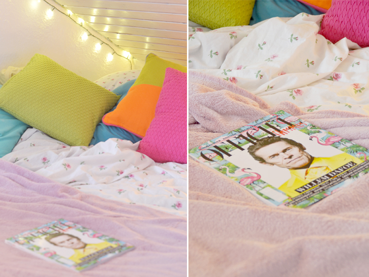 Mein Bett ist nicht nur der Mittelpunkt des Raumes, sondern auch richtig multifunktionell. Durch massenhaft Kissen und meine Kuscheldecke ist es vor allem im Winter mein Sofa-Ersatz. Außerdem ist es auch optisch der wichtigste Teil meines Zimmers. Mein Bett gibt das Farbschema vor. Als zusätzliche Deko fungiert eigentlich immer ein Magazin oder Buch. Meistens eines das als Belohnung auf mich wartet, zum Beispiel, wenn (wie heute!) die Hausarbeiten fertig geschrieben sind.