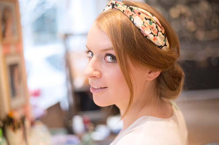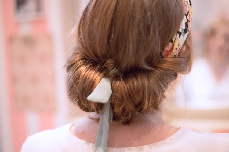 Bringt jetzt das Haarband über dem Haar an, zieht es einfach über den Kopf. Besonders schön sieht es aus, wenn ihr hinten eine Schleife bindet, die ihr später rausschauen lassen könnt. Vorne könnt ihr das Haarband auch mit Klammern feststecken.