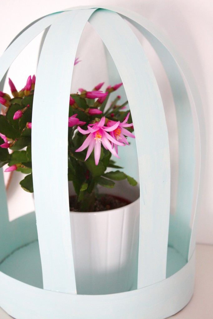 4. Die Pflanze eurer Wahl in den Käfig stellen und die restlichen Pappestreifen festkleben. Und schon ist die Deko fertig!
