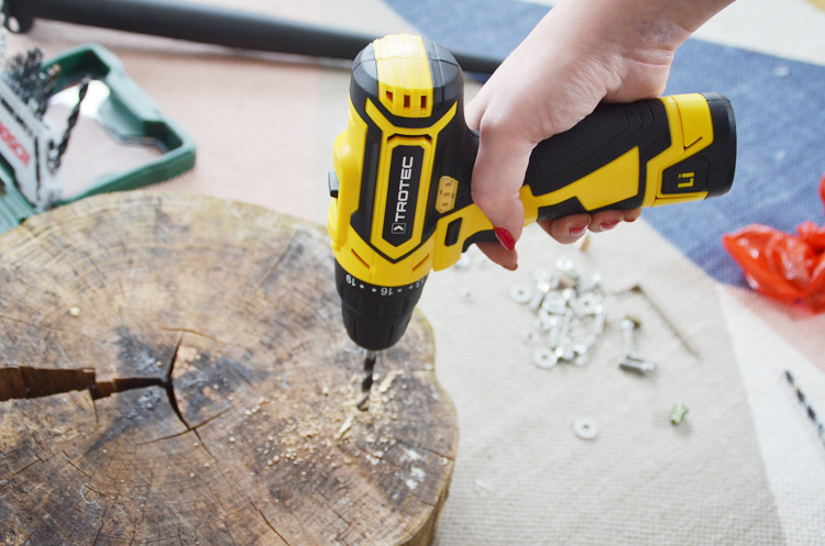 4. Dann bohrt ihr Löcher vor. Wenn ihr die gleichen Füße verwendet, wie ich, braucht ihr einen Bohrer mit der Stärke 7 mm. Dann die Gewindemuffen einsetzen. Die gewährleisten, dass die Füße später auch bombenfest halten. Zum Schluss kommen die Füße dran, werden mit Muttern und den Schrauben in die Muffen geschraubt und schon steht euer Tischchen!