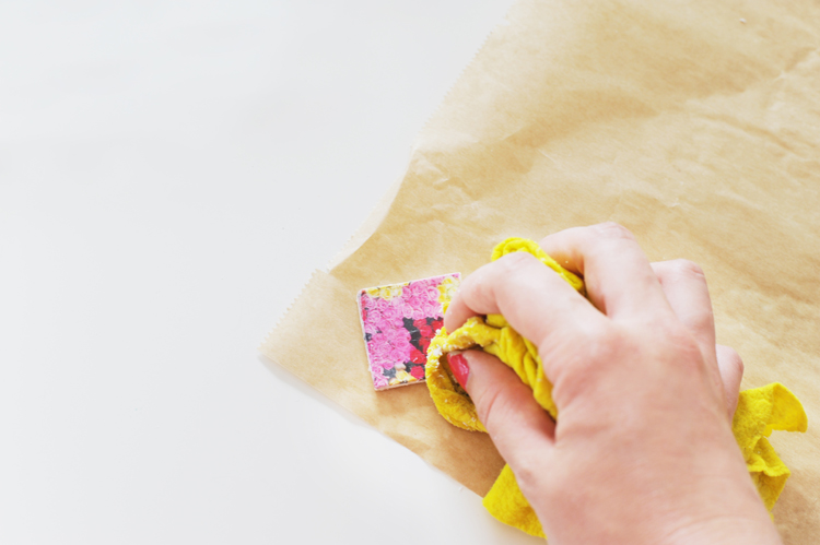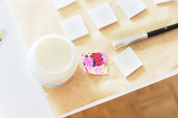 4. Jetzt kommt das Wundermittelchen Fototransfer-Potch zum Einsatz: Bestreicht mit einem Pinsel die bedruckte Seite des Fotos sowie das Formmasse-Quadrat mit einer dünnen Schicht des Klebstoffes. Legt das Foto mit der bedruckten Seite auf und streicht alles gut glatt.