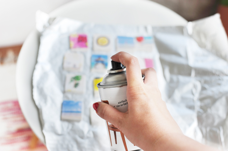 5. Fönt das Ganze nun etwa 10 Minuten mit dem Fön trocken. Alternativ könnt ihr alle Magnete rasch bestreichen, die Fotos aufkleben und alle zusammen dann für etwa 10 Minuten bei 50 Grad (Umluft) in den Ofen stellen.