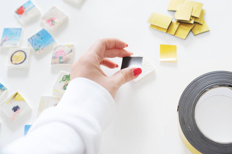 7. Zum Schluss machen wir die kleinen Foto-Quadrate noch zu Magneten. Ich schwöre auf magnetisches Klebeband, weil es so einfach anzuwenden ist. Schneidet kleine Stücke aus dem Klebeband aus und befestigt es mit der selbstklebenden Seite an den Magneten.