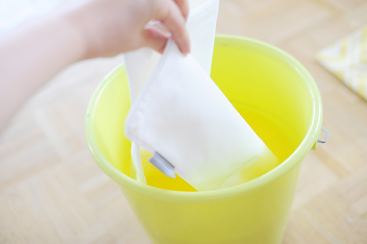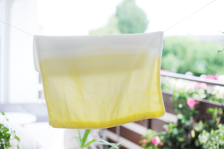 Das ist eine gute Variante für alle, die ein Kissen zum Beispiel, wie hier, im Ombré-Look einfärben wollen. Dazu mischt ihr etwas von der Textilfarbe mit Wasser. Das Mischverhältnis richtet sich danach, wie intensiv das Farbergebnis werden soll. Taucht den Kissenbezug zur Hälfte in das gefärbte Wasser und lasst diesen dann gut trocknen. So bekommt ihr einen ganz leichten Farbverlauf.