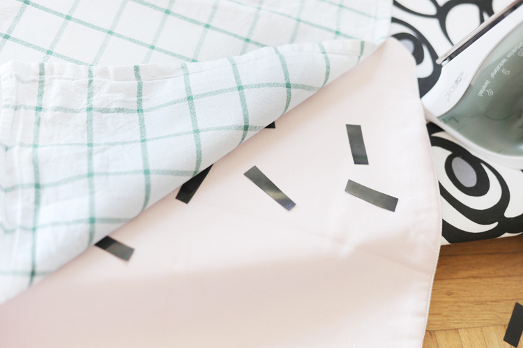 Die zweite Variante ist noch einfacher. Dazu habe ich den hellrosa Kissenbezug verwendet und diesen mit schwarzen Konfetti-Schnippseln beklebt. Dazu habe ich zuerst die Folie abgezogen und dann aus der Folie kleine schwarze “Konfetti”-Streifen ausgeschnitten. Mit der rauen Seite werden die dann aufgelegt und mit Hilfe des Bügeleisens aufgebügelt. Legt dazu ein Handtuch zwischen Kissen und Bügeleisen und bügelt mit hoher Temperatur über die Streifen.