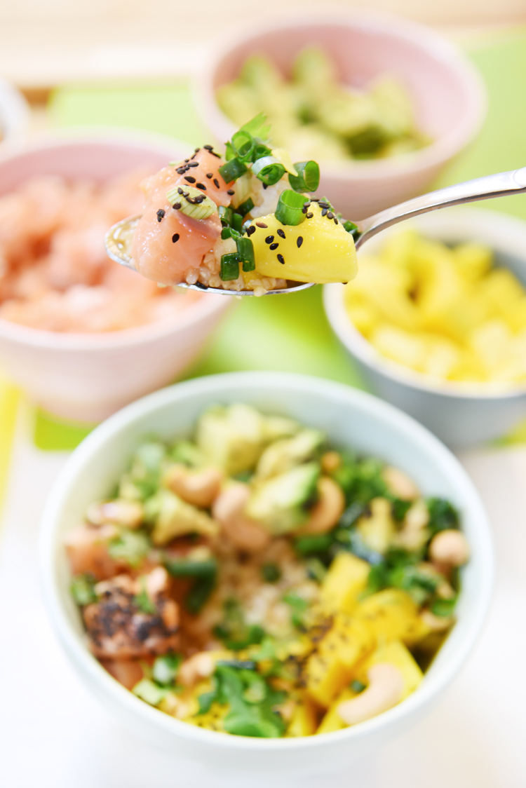Und weil die Poké-Bowl so wunderschön bunt wurde und so fabelhaft schmeckte, möchte ich euch mein momentanes Lieblingsgericht und mein Rezept für Poké-Bowl mit frischem Lachs, Avocado, süßer Mango und knackigen Cashews verraten.