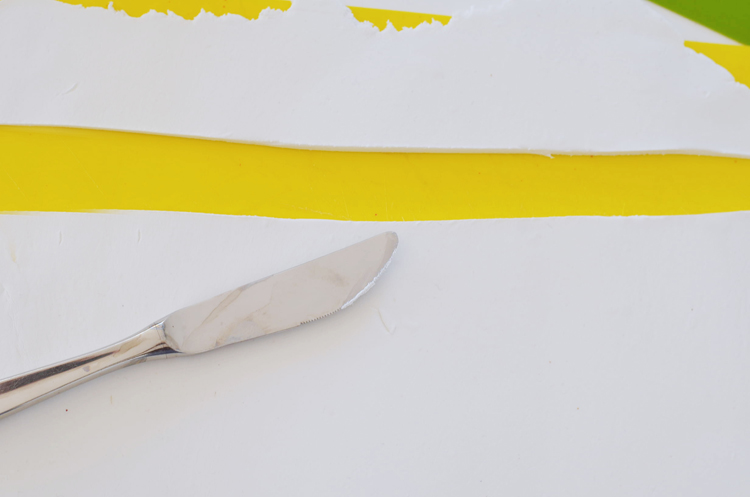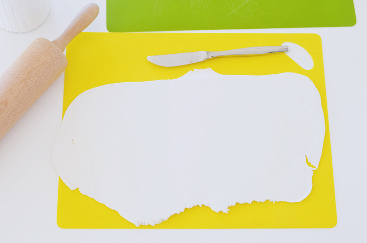 2. Dann könnt ihr die Modelliermasse zuschneiden. Arbeitet hier akkurat, dann sieht das Ergebnis nachher am schönsten aus.