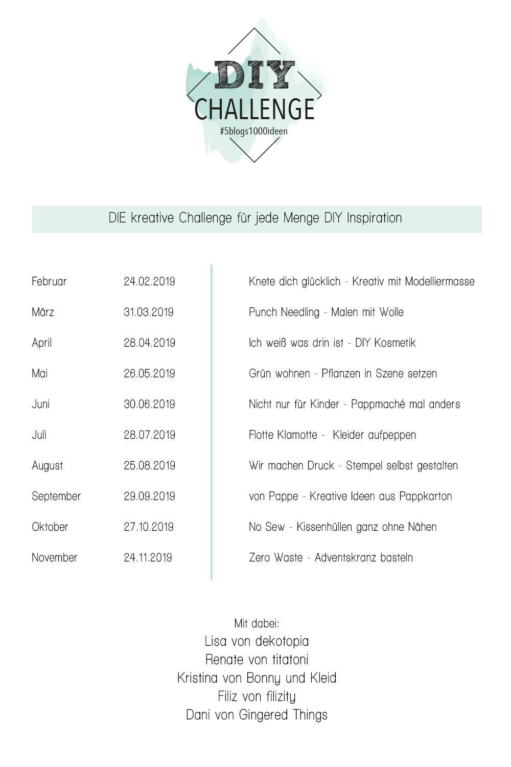 Auch die DIY-Challenge erwacht heute aus dem Winterschlaf und ist mit ein paar Neuerungen am Start. Die wichtigste Änderung zuerst: In dieser Runde kam Filiz mit zu unserer fünfköpfigen Mädelsrunde dazu. Jule widmet sich in diesem Jahr ganz anderen Herausforderungen und so freuen wir uns mit Jule mit für alles was da für sie kommt und sind gespannt, was sich in der neuen Formation für Ideen zu den 11 vorgegebenen Monatsthemen ergeben.