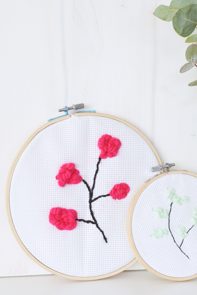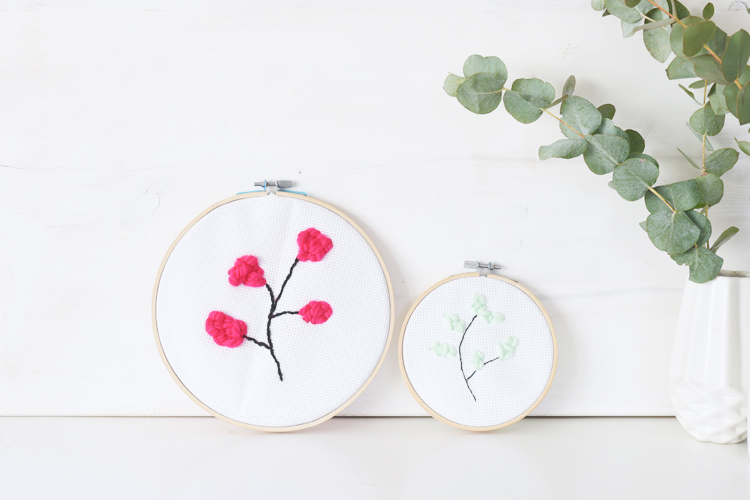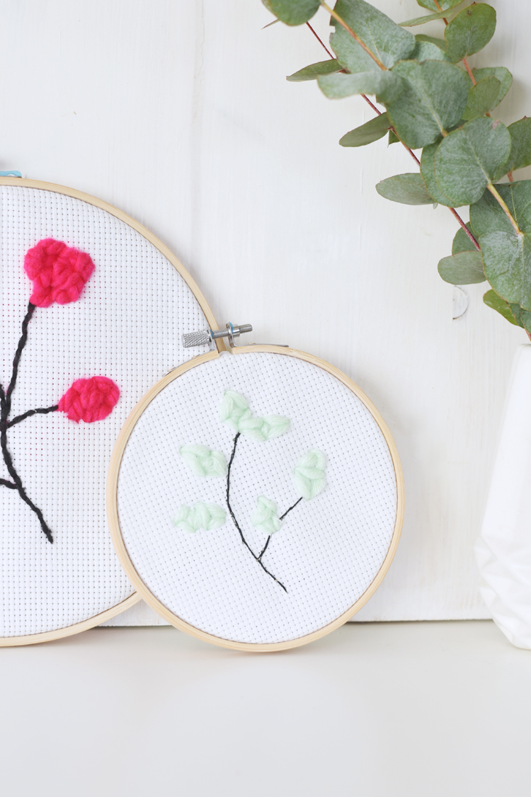 Wie lange ich für meine zwei Stickwerke gebraucht habe, wollt ihr nicht wissen. Ich musste mehrmals neu anfangen und habe viel Stoff, Wolle und Zeit verbraucht. Am Ende hat es dann aber geklappt. Ich wollte unbedingt etwas Florales machen und habe vor die Motive auch noch auf Kissenhüllen zu bringen. Zunächst war der grobe Aida-Stoff allerdings perfekt, um die Technik zu erlenen.