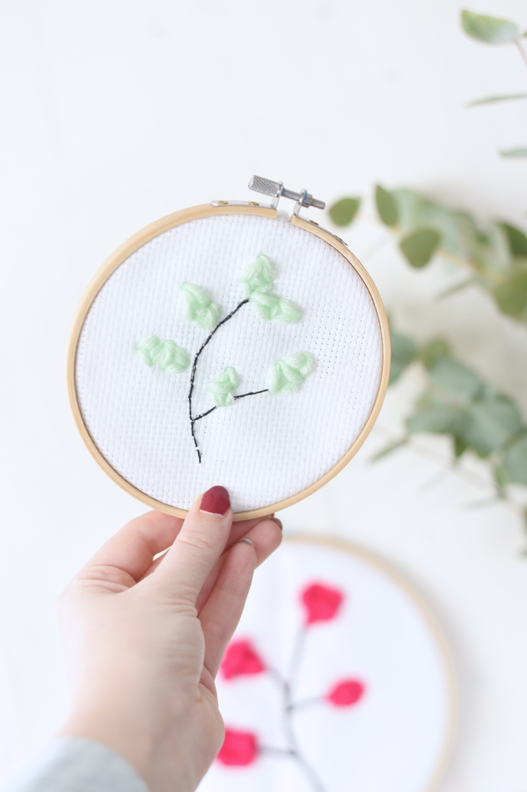 Ich bin eigentlich kein Fan vom Sticken. Für das milimeterlange, langwierige Arbeiten bin ich nicht gemacht und einfach zu ungeduldig. Punch Needling sollte also eigentlich voll mein Ding sein. Es geht wirklich super schnell. Für die Blüten und Blätter habe ich (als ich es dann einigermaßen raushatte) nicht mal zehn Minuten gebraucht. Das klassische Sticken mit der Nadel der Zweige hat dafür fast doppelt so lang gedauert.
