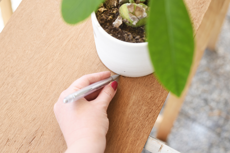 1. Zeichnet die Umrisse eurer Blumentöpfe auf die Holzplatte auf. Ich habe einen Holzrest verwendet – eine dünne Spanplatte. Ihr könnt je nach Belieben natürlich auch dickeres Holz verwenden.