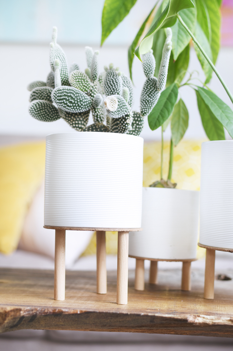 Zum Schluss könnt ihr die Ständer natürlich noch ansprühen oder bunt bemalen. Bei mir bleiben sie erstmal im hellen Holzton, weil das schön zu den schlicht-weißen Töpfen passt.