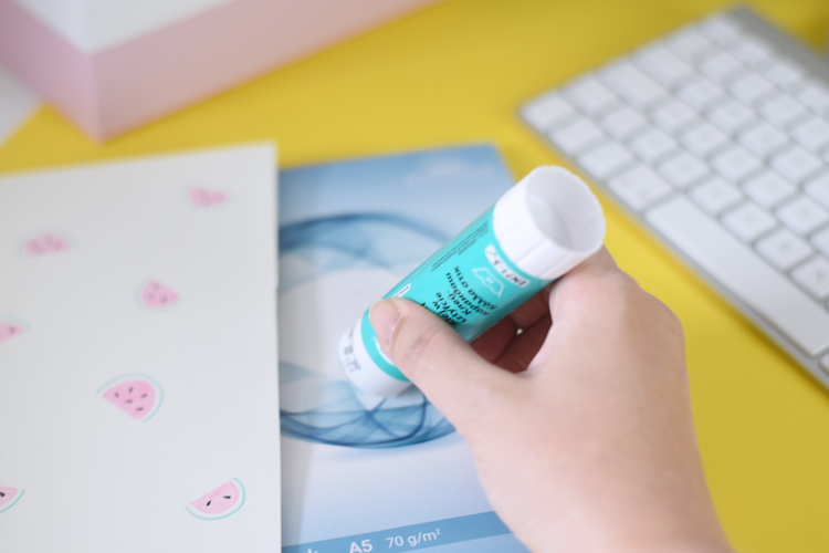 Ich habe weiße Ordner und eine schlichte Box mit den Stiften verschönert. Außerdem habe ich – das war bei mir schon früher Pflichtprogramm für jeden Schreibblock – das Cover mit Tonkarton beklebt und bemalt. So passt alles zusammen und entspricht dem eigenen Stil: wie die Frixion-Stifte, die mit den personalisierten Aufklebern ebenfalls voll ins Bild passen.