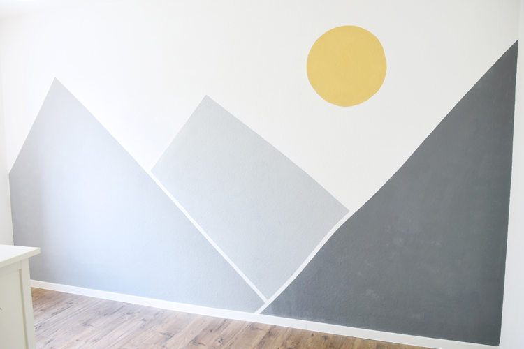Zunächst habe ich die Berge abgeklebt. Wenn ihr dazu einen Meterstab zur Hand nehmt, wird das Ergebnis auch schön gerade. Dann habe ich sehr gewissenhaft abgeklebt. Da wir eine Raufasertapete haben, musste ich das Tape wirklich sehr fest andrücken, damit es nachher eine klare Kante gibt. Bei einem der Berge war ich etwas nachlässig – sieht man auch, da lief die ganze Farbe durch das Tape hindurch. Nicht schlimm, man kann ja mit weißer Farbe nochmal nachbessern. Aber ihr erspart euch viel Arbeit, wenn ihr sauber und gewissenhaft abklebt.