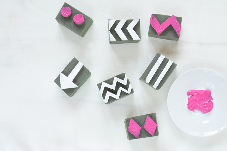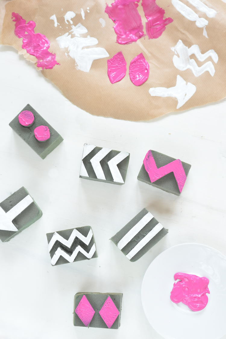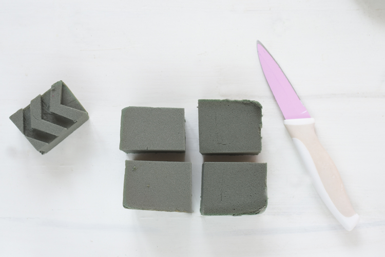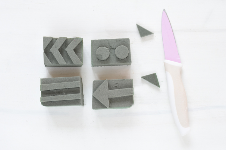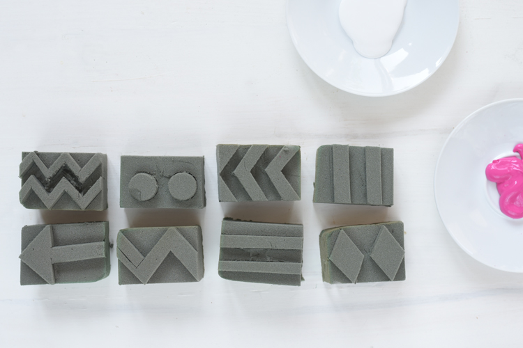 Die Stempel-Variante mit Steckmoos ist dabei aus der Not entstanden: Ich wollte eigentlich Stempel aus Moosgummi basteln, das hatte ich dann aber nicht mehr auf Lager. Dann fiel mir der Block Steckmoos in die Hände und tatsächlich eignet sich das hervorragend zum Stempel schnitzen. Das Material ist weich, aber gerade hart genug, damit man beim Stempeln etwas Druck ausüben kann. Außerdem saugt es die Farbe nicht auf, ideal für eine mehrmalige Verwendung. Ihr könnt es ganz individuell in jeglicher Größe zuschneiden und seid bei den Mustern ganz frei.