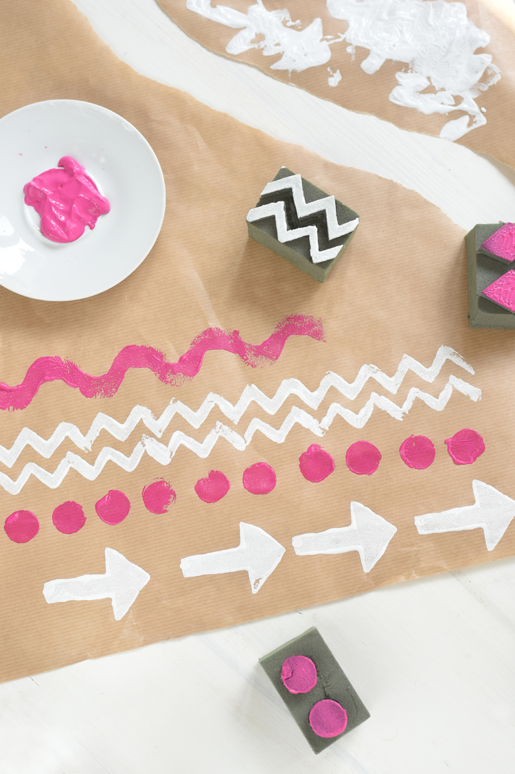 Bei Geschenkpapier verwende ich fast ausschließlich Packpapier, dass ich dann mit Tape, Band oder Kärtchen aufhübsche – oder es individuell bemale. Eine schöne Alternative ist auch zu stempeln. Aus Steckmoos habe ich mir ganz einfach ein paar Stempel mit grafischen Mustern ausgeschnitzt, mit denen sich das Packpapier besonders schön und schnell bedrucken lässt. So sieht jedes Geschenk anders aus.