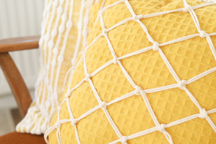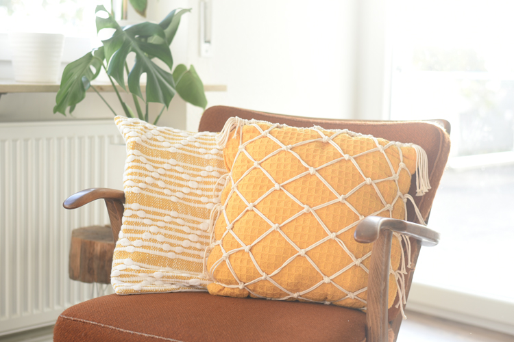 Zu Anfang kommt einem das vielleicht sehr kompliziert vor. Den Kreuzknoten musste ich zum Beispiel auch erst mehrmals mit Videoanleitung knoten, bis es ganz automatisch ging. Das Rautenmuster später zu knoten ist dafür super easy und im Großen und Ganzen braucht ihr für den Makramee-Kissenbezug maximal eine Stunde.