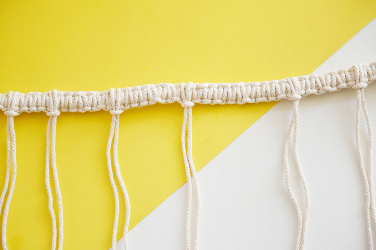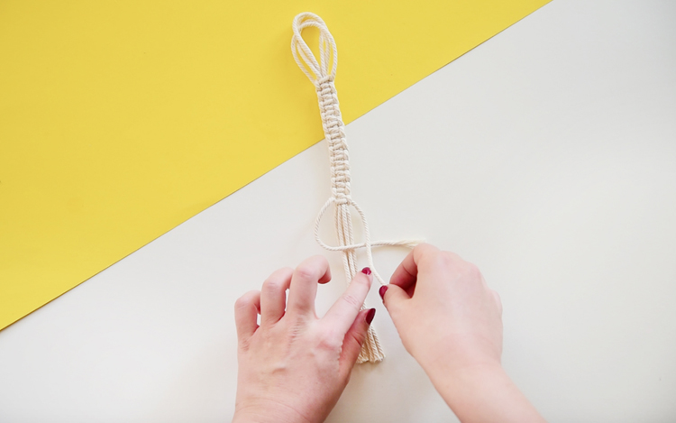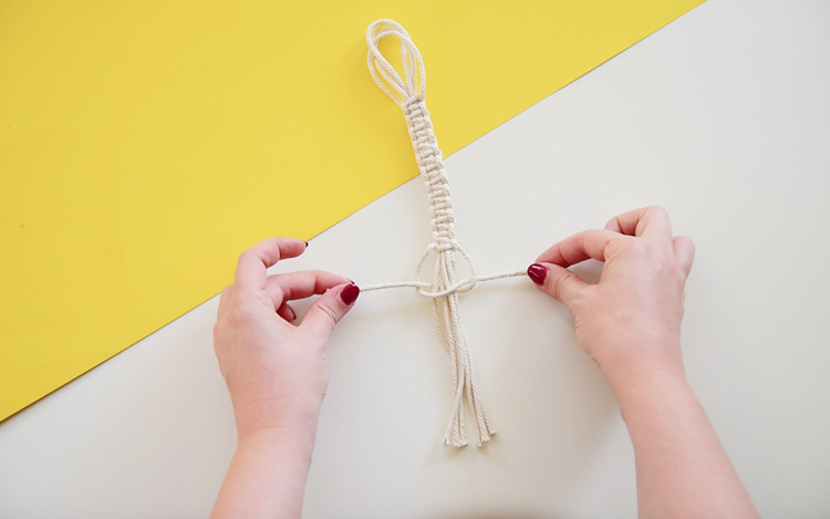 4. Dann knotet ihr die Enden der Stränge von der anderen Seite aus wieder oben an die Kreuzknoten-Kordel an.