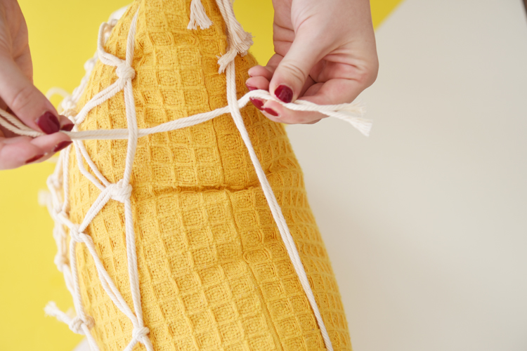 5. Als letztes wird der Bezug seitlich noch miteinander verbunden. Ihr benötigt 16 Stränge mit 30 cm Länge. Nehmt immer zwei davon und knotet seitlich am Kissen den Bezug fest. Die Enden könnt ihr wieder stehen lassen, sie bilden einen fransigen Abschluss.