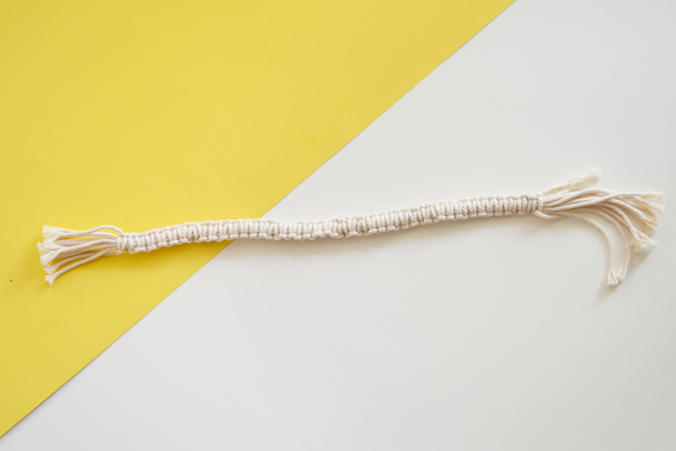 1. Zuerst knüpfen wir das “Grundgerüst” für unseren Bezug. Das besteht aus einem geknüpften Teil mit einer Länge von 40 cm. An dieser Kordel hängt der ganze Bezug, sie ist also unsere Basis. Sie wird mit einem Kreuzknoten geknüpft. Ihr braucht dafür 12 Garnstränge. Mit dem “doppelten halben Schlag” könnt ihr dKnotet so viele Kreuzknoten, bis ihr eine 40 cm lange Kordel habt. Die Enden lasse ich einfach etwa 20 cm lose stehen.