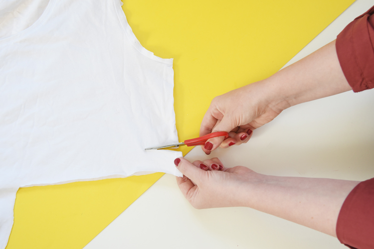 SCHRITT 1: Schneidet den Ärmel eures Shirts entlang der Naht ab. Das Teil bildet die Basis eurer Maske und kommt später über Mund und Nase.