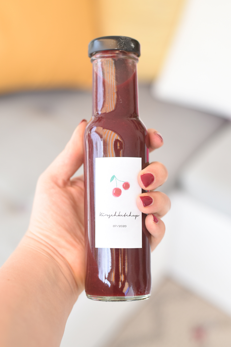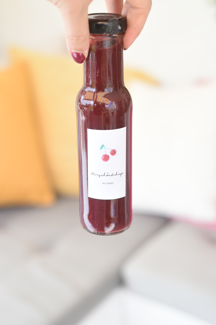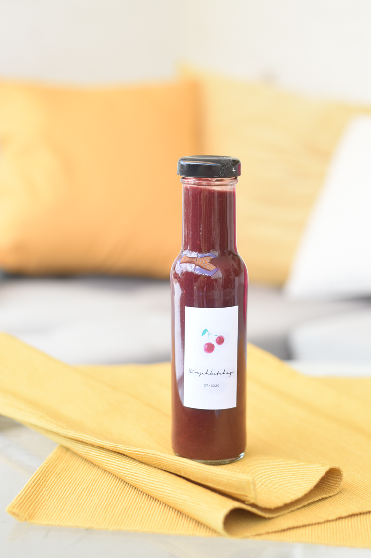 Ladet euch hier das Freebie, für mein Kirsch-Ketchup-Etikett runter. Schreibt unbedingt noch das Datum mit drauf, wenn ihr die Gefäße ausgekocht habt und den Ketchup direkt einfüllt, hält er sich locker einen Monat, eher länger im Kühlschrank.