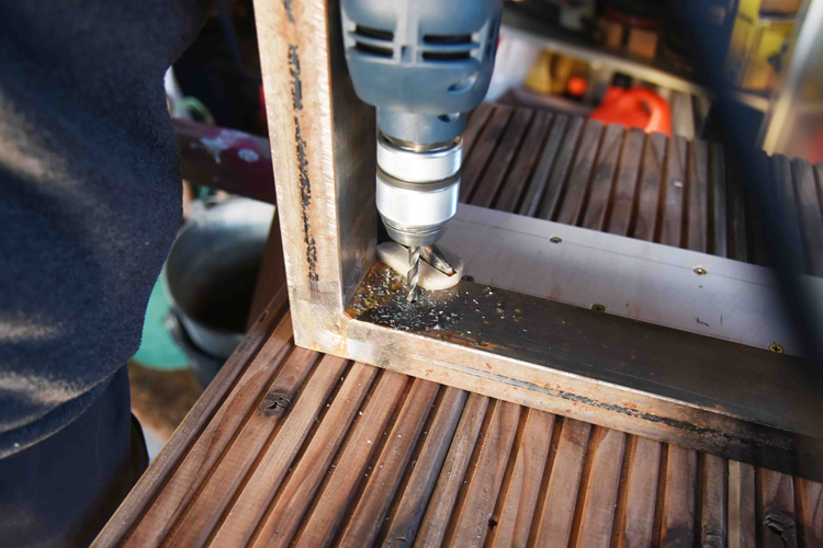 Zum Schluss müssen die Kufenbeine nur noch an die Sitzfläche geschraubt werden. Zunächst bohrt ihr dazu die Löcher mit einer Stärke von 6,5 vor. Dann werden die Beine mit Schlosschrauben befestigt.