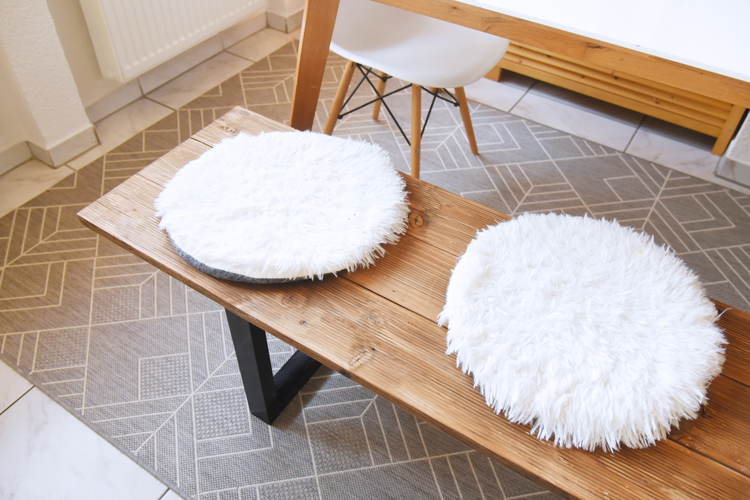 Wie gefällt euch das Ergebnis? Aktuell steht die Bank noch gar nicht in der Ecke an der Wand, sondern am offenen Ende des Esstisches. Da kommt sie besser zur Geltung und sieht so gemütlich aus mit den Fellauflegern. Wir testen die Tage mal aus, wie sie sich in der Ecke macht. Für die habe ich sie ja maßangefertigt.