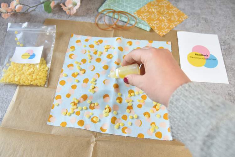 Streut dann ein paar der Bienenwachstpastillen auf das Tuch, lasst ebenfalls etwas Abstand und achtet drauf, dass die Pastillen gut verteilt sind.