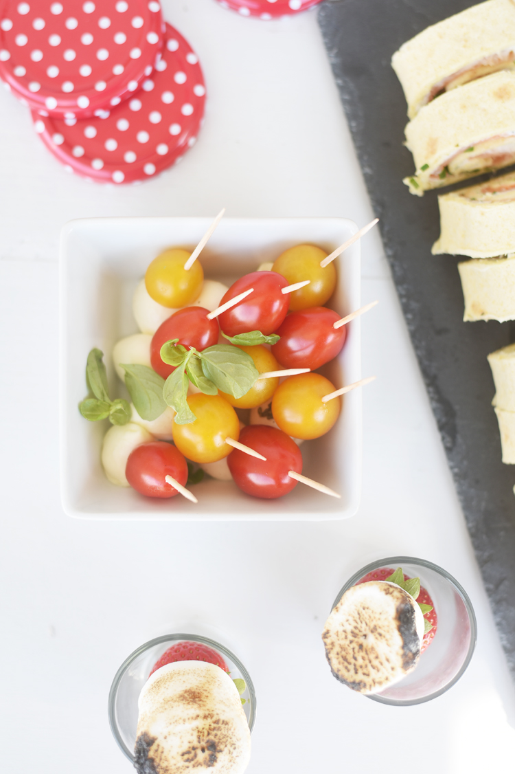 Spießt Mozarella und Tomaten auf und garniert sie zum Schluss mit Basilikum. Wer mag, kann das Ganze noch mit etwas Basilikumcreme verfeinern.
