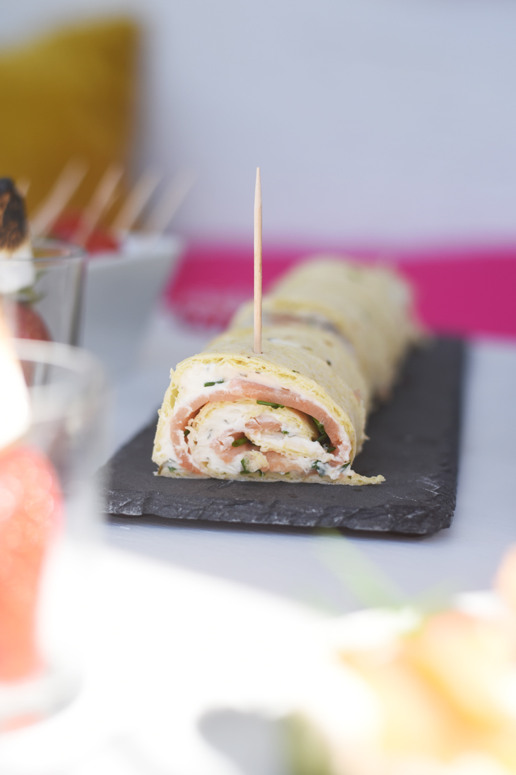 Gebt den Wrap kurz für 20 Sekunden in die Mikrowelle, damit er weich wird. Streicht ihn dick mit Frischkäse ein, belegt ihn mit dem Räucherlachs und rollt ihn straff zusammen. Schneidet ihn dann in kleine Röllchen, die ihr mit Zahnstochern befestigen könnt.