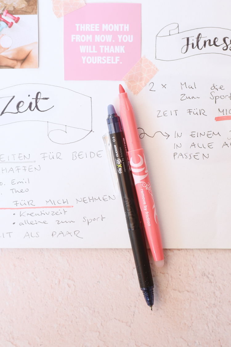 Wie dein Vision Board aussieht ist dir überlassen und letztlich Geschmacksache. Es gibt Vorlagen und Apps, die helfen oder du machst es ganz analog und bastelst dein Vision Board. So wie ich. Ich habe mir ein großes, weißes Papier genommen. Bilder und Zitate gesucht, die mich motivieren und dann mit dem FriXion Point Clicker losgelegt und meine Wünsche und Ziele schriftlich aufs Papier gebracht.