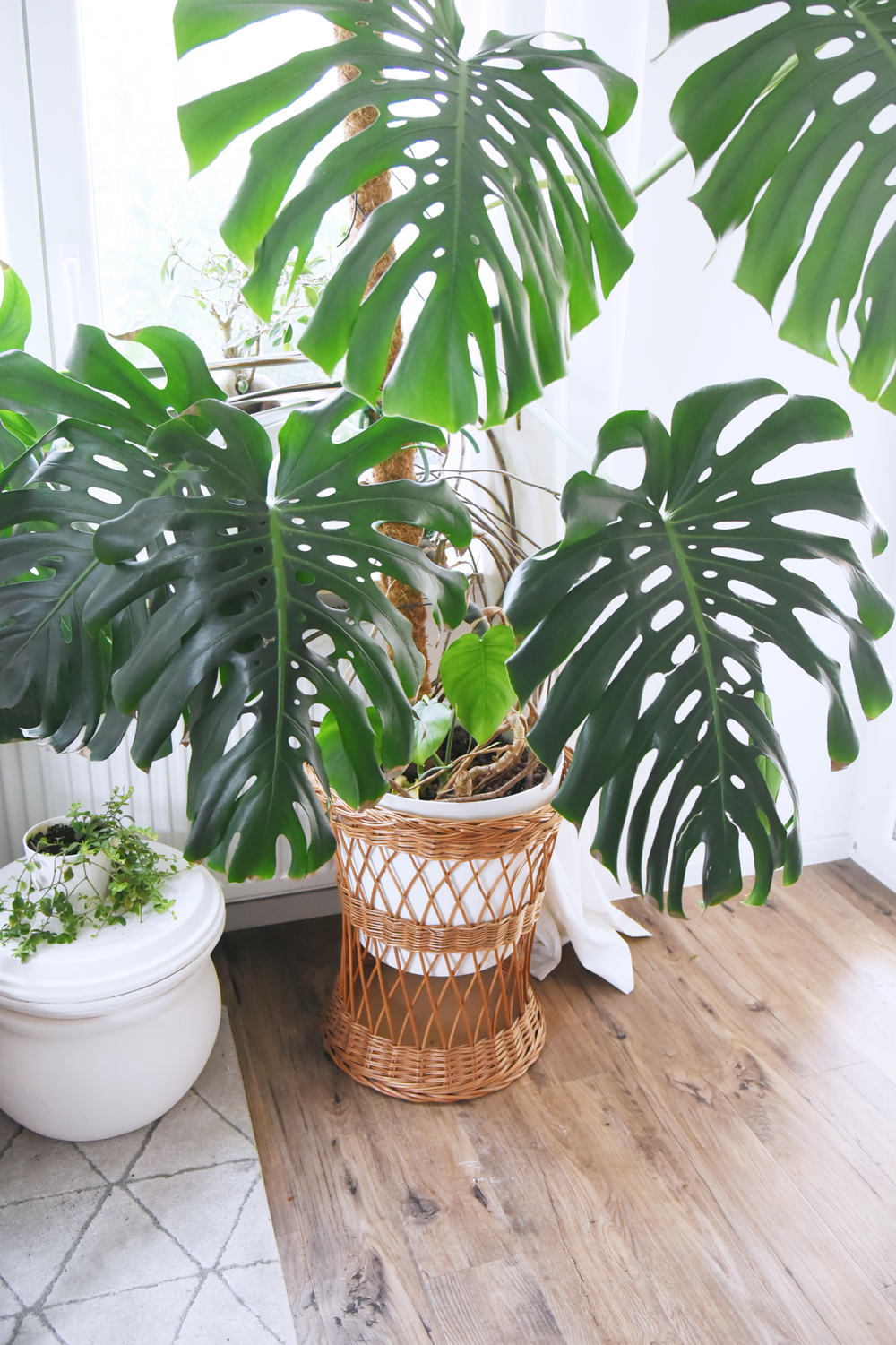 Zwei Tage lang stand der Sperrmüll der Nachbarn draußen. Zwei Tage habe ich diesen großen, runden Rattan-Korb angeschmachtet und überlegt, ob ich ihn der Tonne überlassen soll… Zum Glück bin ich letztlich doch rüber und habe gefragt, ob ich den Korb mitnehmen darf. Es handelte sich um einen Wäschekorb aus den 70ern. Wirklich ein hübsches Teil. Ich habe den Griff abgemacht und jetzt finde ich, ist der Korb der perfekte Pflanzenständer für meine riesen Monstera. Das nur so als Inspiration… man kann wirklich aus vielen Dingen, auch aus ganz Banalen einen tollen Pflanzenständer bauen. Es eignen sich auch verschiedene Tontöpfe, um diese zu einem tollen Ständer zu stapeln.