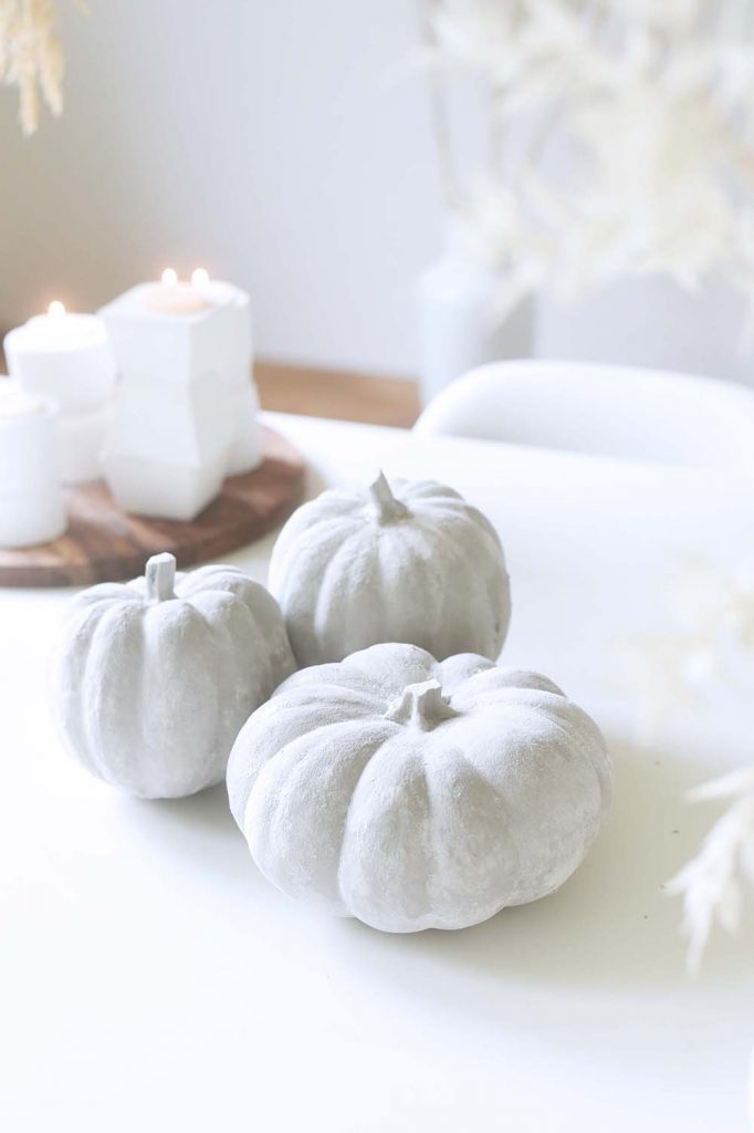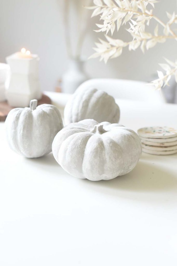 Ich habe ein Video gesehen, wie man für Kürbisse einen Keramik- bzw. Betoneffekt erzielen kann, indem man sie mit Mehl bestreut. Ich dachte: Mega, wie einfach! Und legte los.