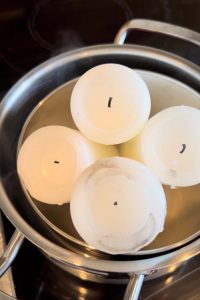 Lasst das Wachs aushärten, schneidet den Docht von den Spießen und gießt ggf. noch etwas Wachs in die entstandene Mulde.