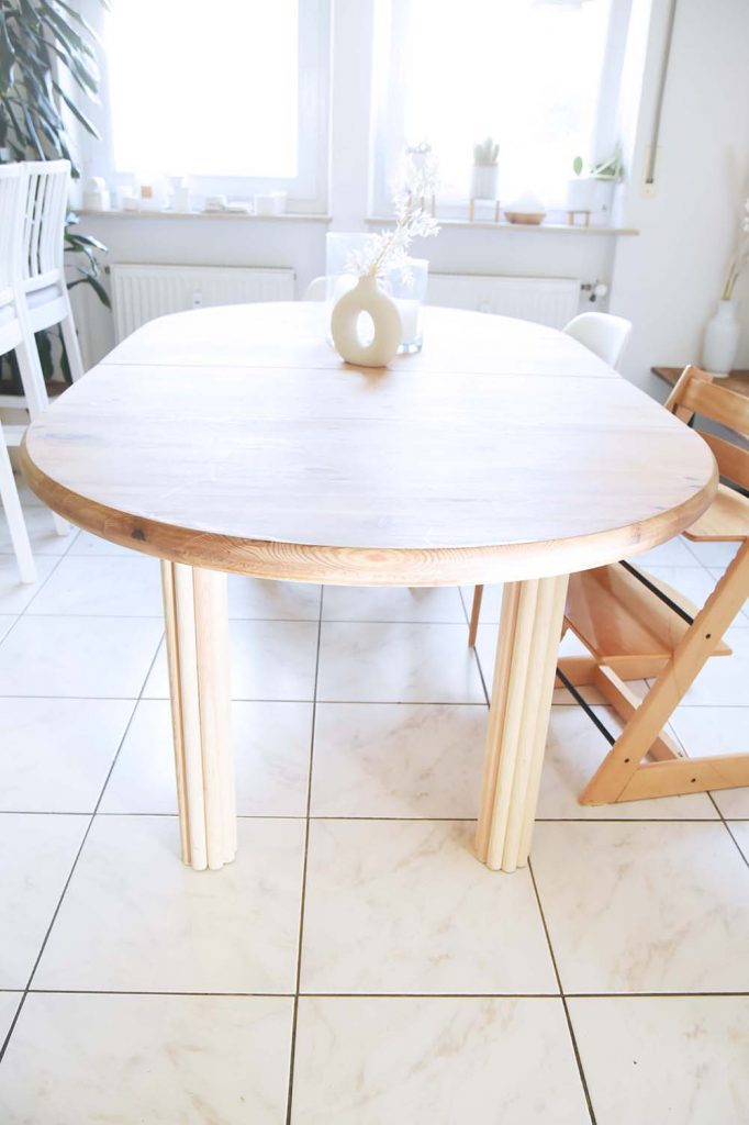 Beim Material kommt es ganz drauf an, was euch gefällt. Kufentischbeine oder was ganz anderes sind ebenso möglich, wie meine runden Tischbeine. Ich habe mich dazu entschieden günstige runde Beine gebraucht zu besorgen und diese dann zu verkleiden. Schaut mal in den Kleinanzeigen, dort findet man solche oft. Optisch sind die nicht so schön, aber man kann sie einfach verkleiden und erhält so sehr individuelle und stabile Beine.