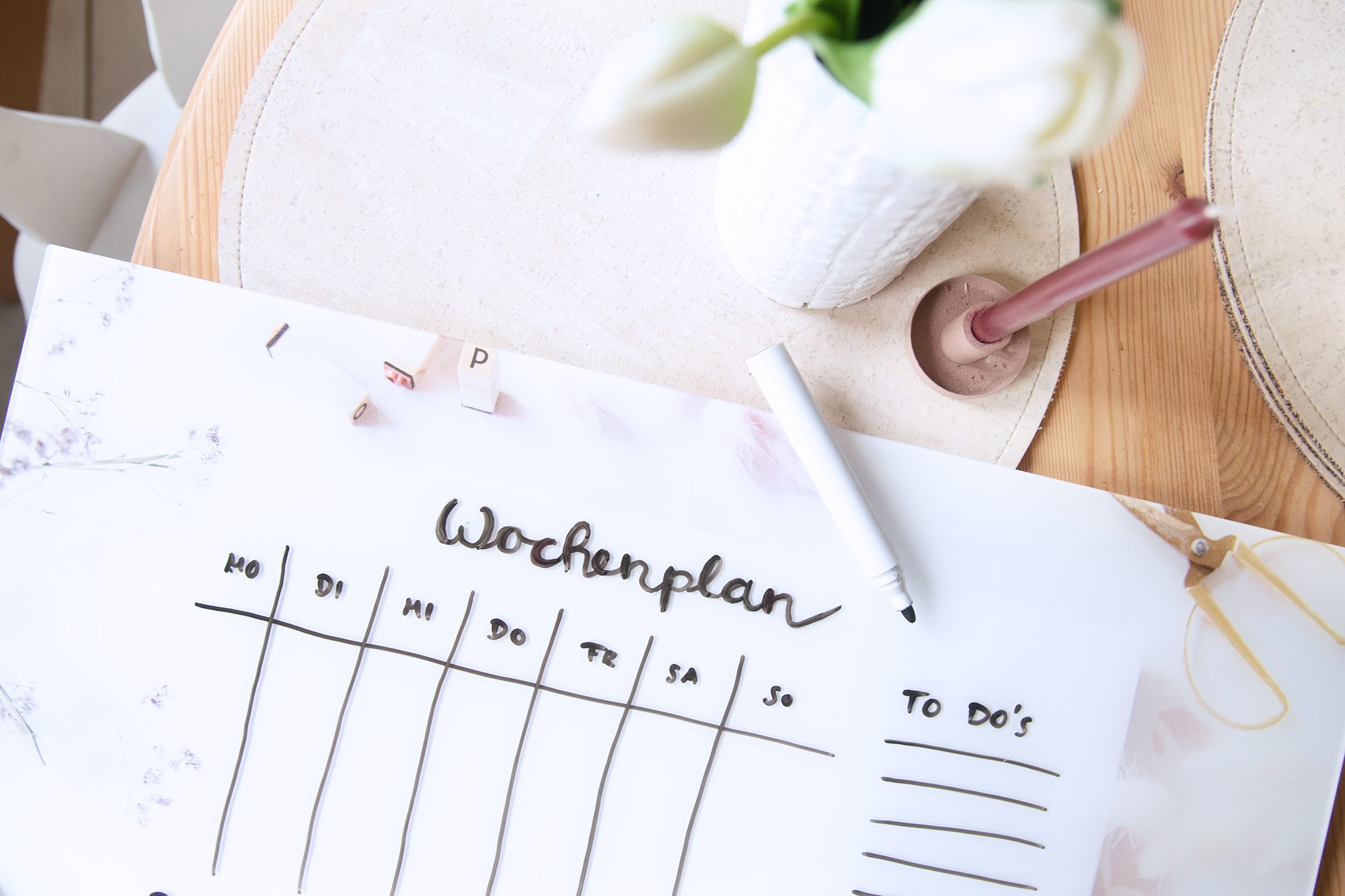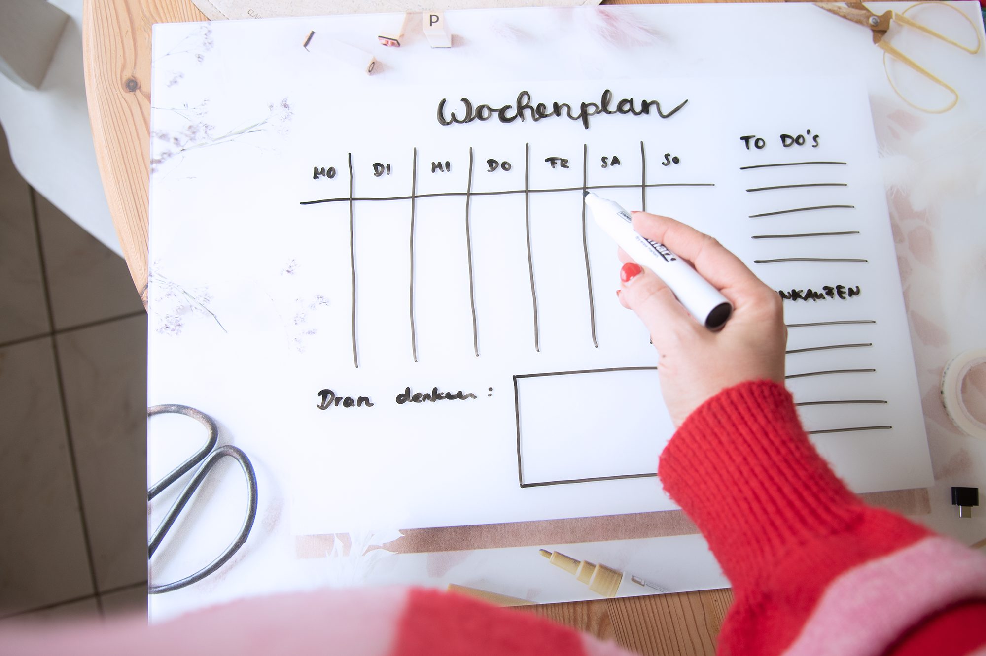 - mit einem Glasmarker kannst du alle Punkte zu Wochenbeginn eintragen und zur neuen Woche abwischen. Fehler lassen sich leicht korrigieren.
