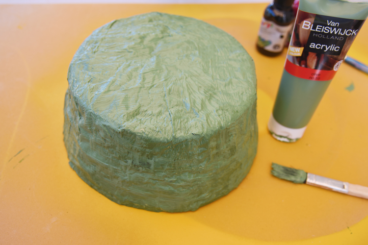 4. Wenn alles gut durchgetrocknet ist, könnt ihr die Frischhaltefolie und die Pappmaché-Schale einfach abziehen. Schneidet die Ränder grade. Nun geht es ans Bemalen: Ich habe die Schale in Wassermelonen-Optik bemalt. Tobt euch aus, ganz viele verschiedene Farben, Muster und Motive sind denkbar.