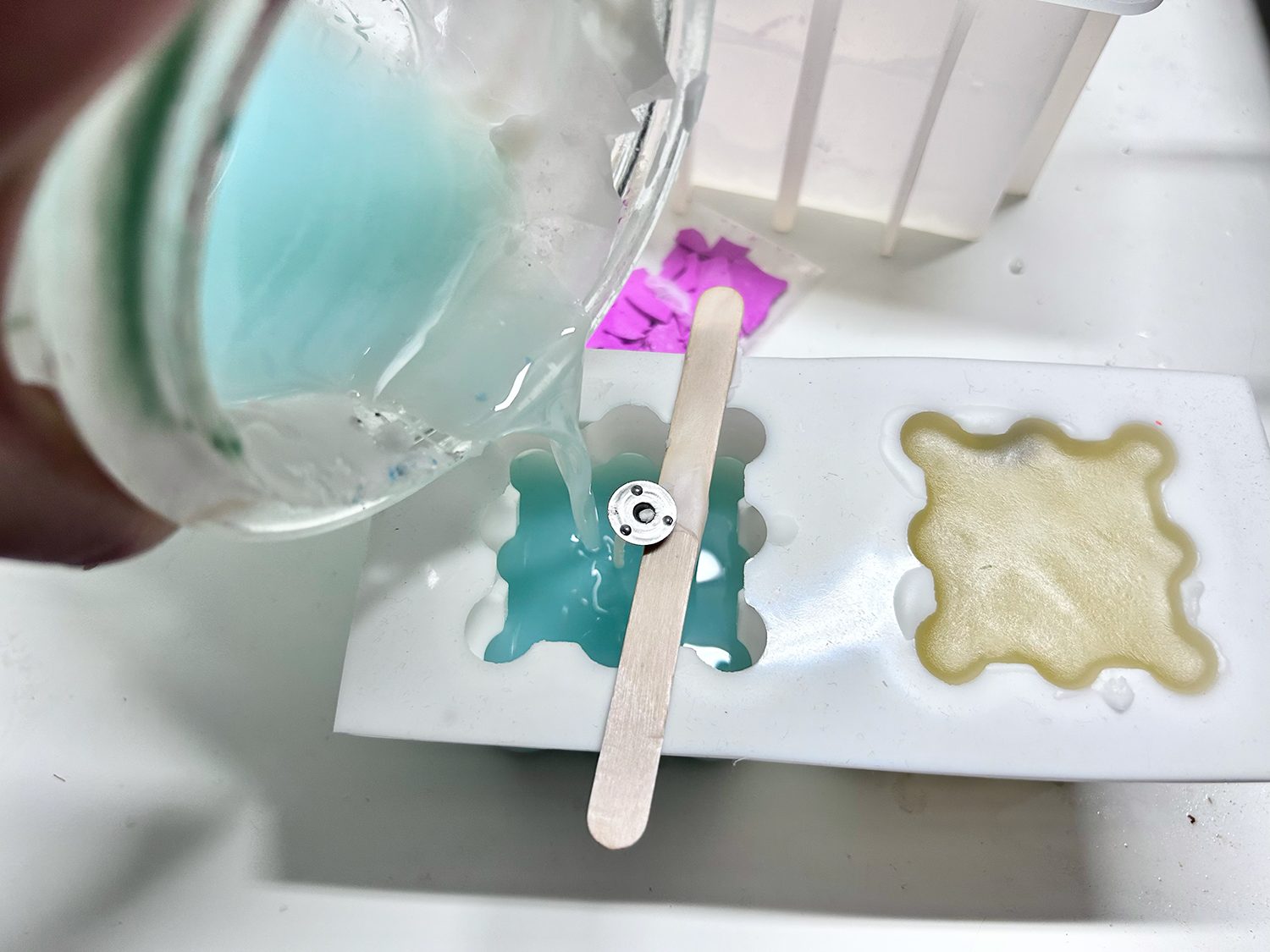 Während das Wachs schmilzt kannst du den Docht durch die Silikonform ziehen. Dazu stichst du in der Mitte der Form ein Loch durch das Silikon, wodurch du dann den Docht ziehen kannst. Zum Durchstehen eignet sich eine dickere Nadel, ein Nagel, eine Schraube oder eine spitze Schere. Steche nur ein kleines Loch hinein, wodurch der Docht gerade so passt. Ziehe den Docht dann wie im Bild gezeigt durch die Form und fixiere das Ende mit den Holzspateln, damit der Docht beim Gießen an Ort und Stelle bleibt. Falls das nicht so gut klappen sollte könnt ihr etwas Wachs oder Klebeband verwenden um ihn am Spatel zu fixieren.