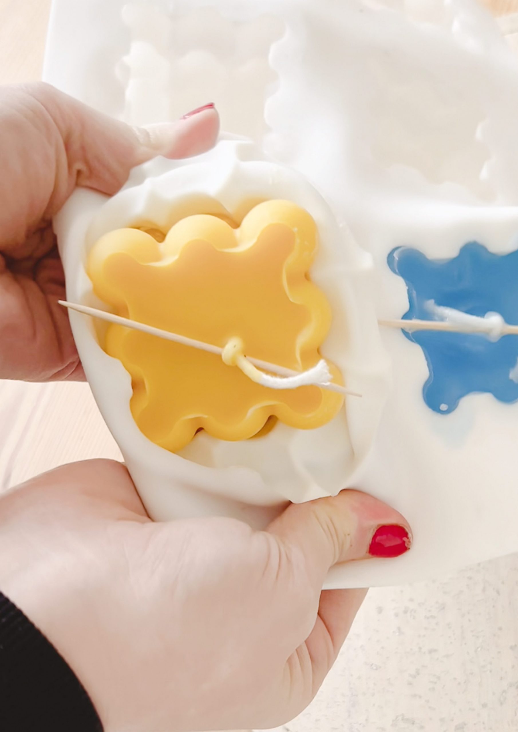Das passiert, wenn das neue Wachs in die Form gegossen wird, während die alte Schicht noch flüssig war. Dann vermengen sich beide Wachsfarben. Das kann einen schönen Ómbre-Effekt mit Farbverlauf ergeben, aber wenn eine klare Kante erwünscht ist, rate ich zu warten, bis die erste Schicht schon hart, aber noch warm ist.