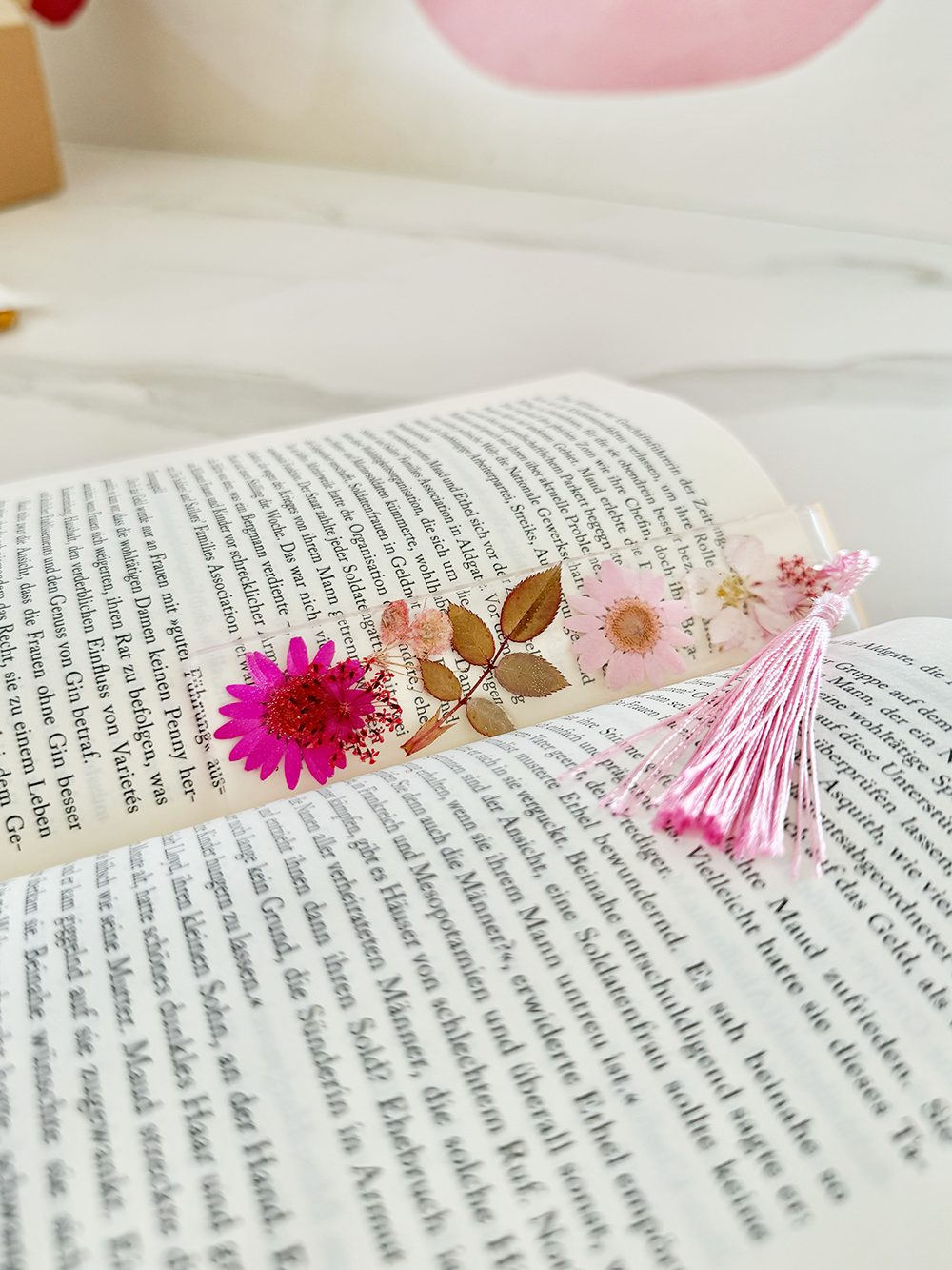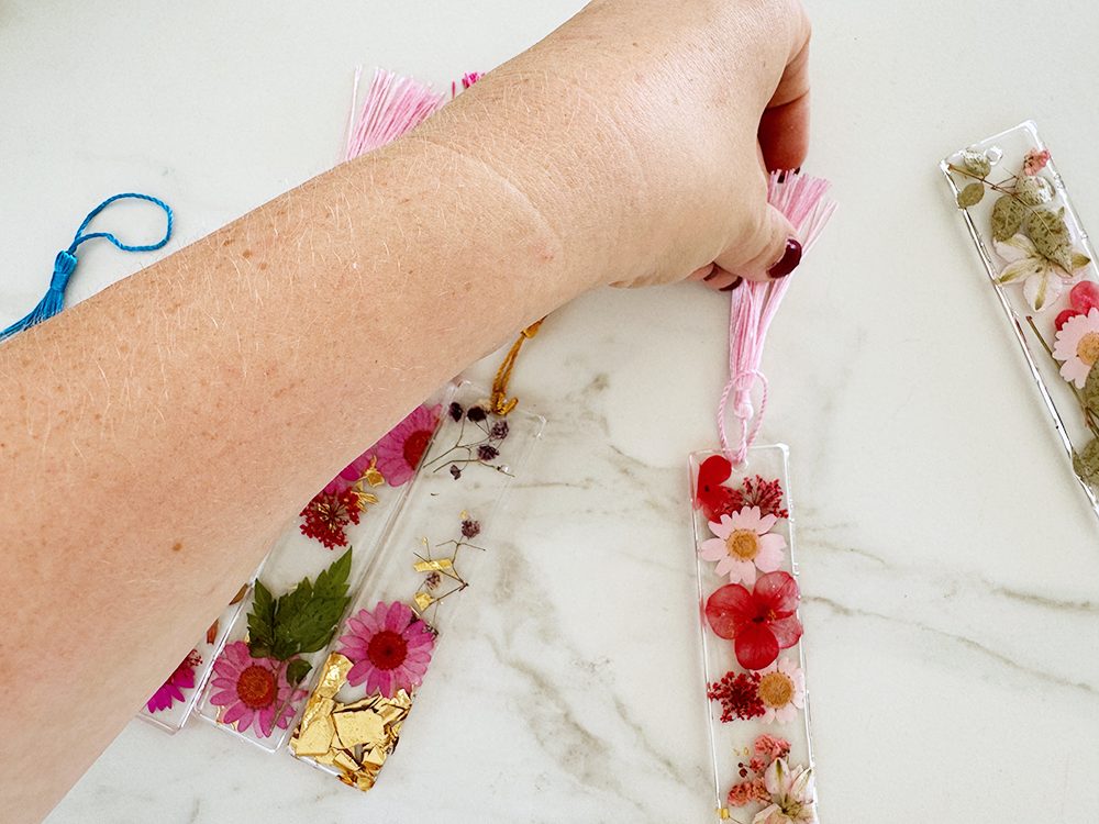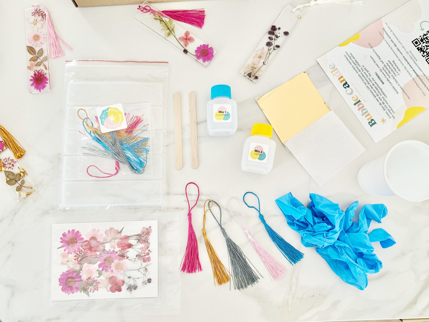 Nach dem Aushärten kannst du die Lesezeichen aus der Form lösen. Im Set sind fünf verschiedene Tasseln enthalten. Du kannst sie ganz einfach mit einem Knoten durch das Loch deines Resin-Lesezeichens befestigen.