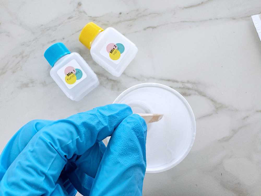 Verwende die Fläschchen mit der Aufschrift “Kunstharz A” und das mit der Aufschrift “Härter B”. Beides ist exakt abgewogen. Zusammen reicht die Menge für vier Lesezeichen. Willst du nur zwei Lesezeichen machen reicht ein Fläschchen vom “Kunstharz A” und “Härter B”. Schütte beide Teile in den Rührbecher und achte darauf, die komplette Flüssigkeit in den Becher zu gießen, damit das Mischungsverhältnis stimmt. Rühre dann vorsichtig beide Flüssigkeiten, bis keine Schlieren mehr zu sehen sind.
