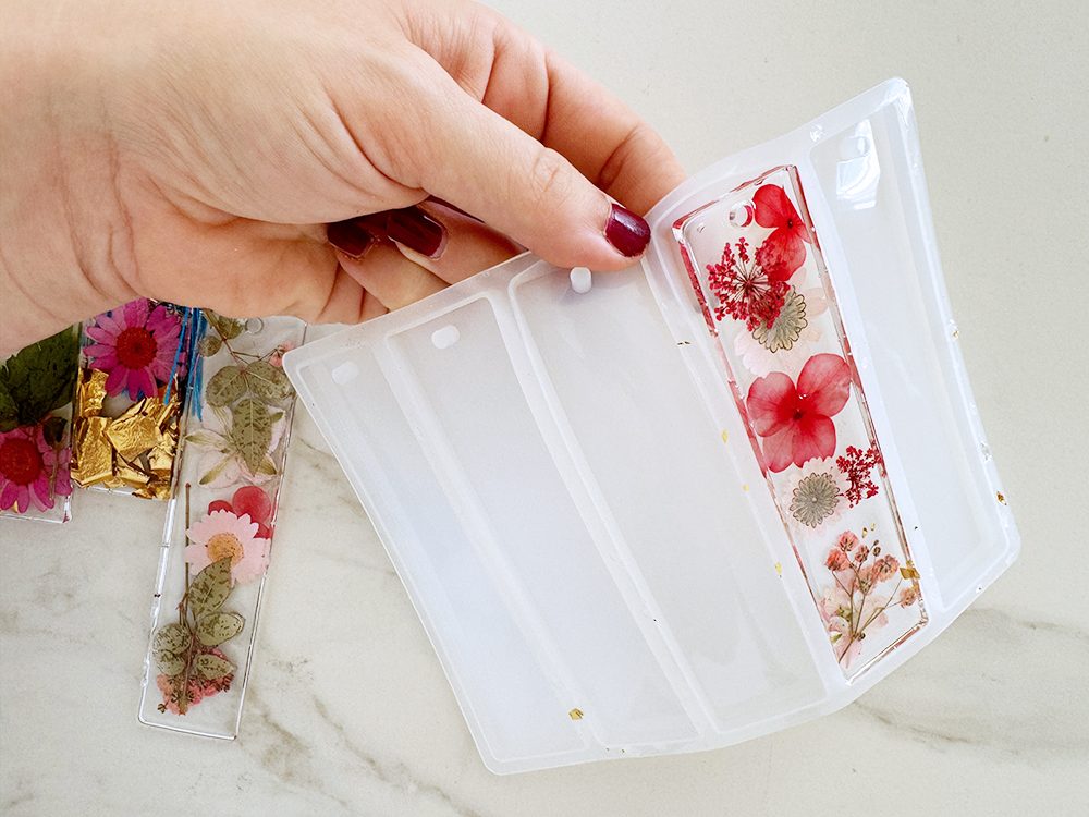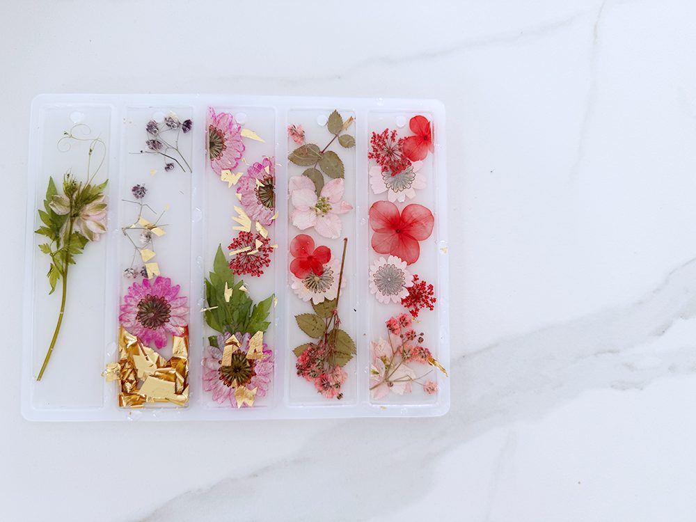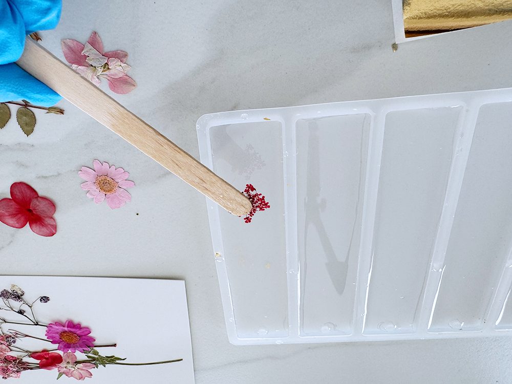 Gieße nun die Resin-Masse gleichmäßig in die vier Mulden deiner Silikonformen und dekoriere deine Lesezeichen nach deinen Wünschen mit Trockenblumen und/oder der Gold-Folie. Um die Dekoration in die Form zu bekommen, kannst du den Rührspatel verwenden und das Material leicht nach unten drücken. Tipp: Die großen Blumen am besten teilen, zum Beispiel mit einem Cutter-Messer oder der Schere, dann passen sie besser in die Form.